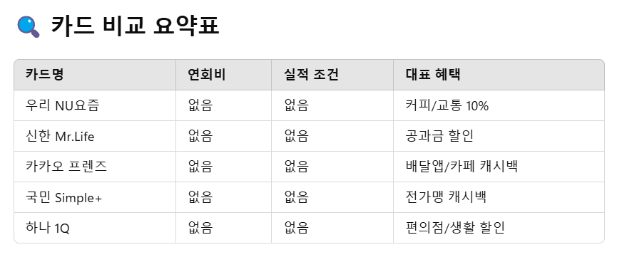 그래서 오늘은 연회비가 없고, 실적 조건 없이도 혜택이 있는 실속 카드들만 골라 소개해드릴게요.