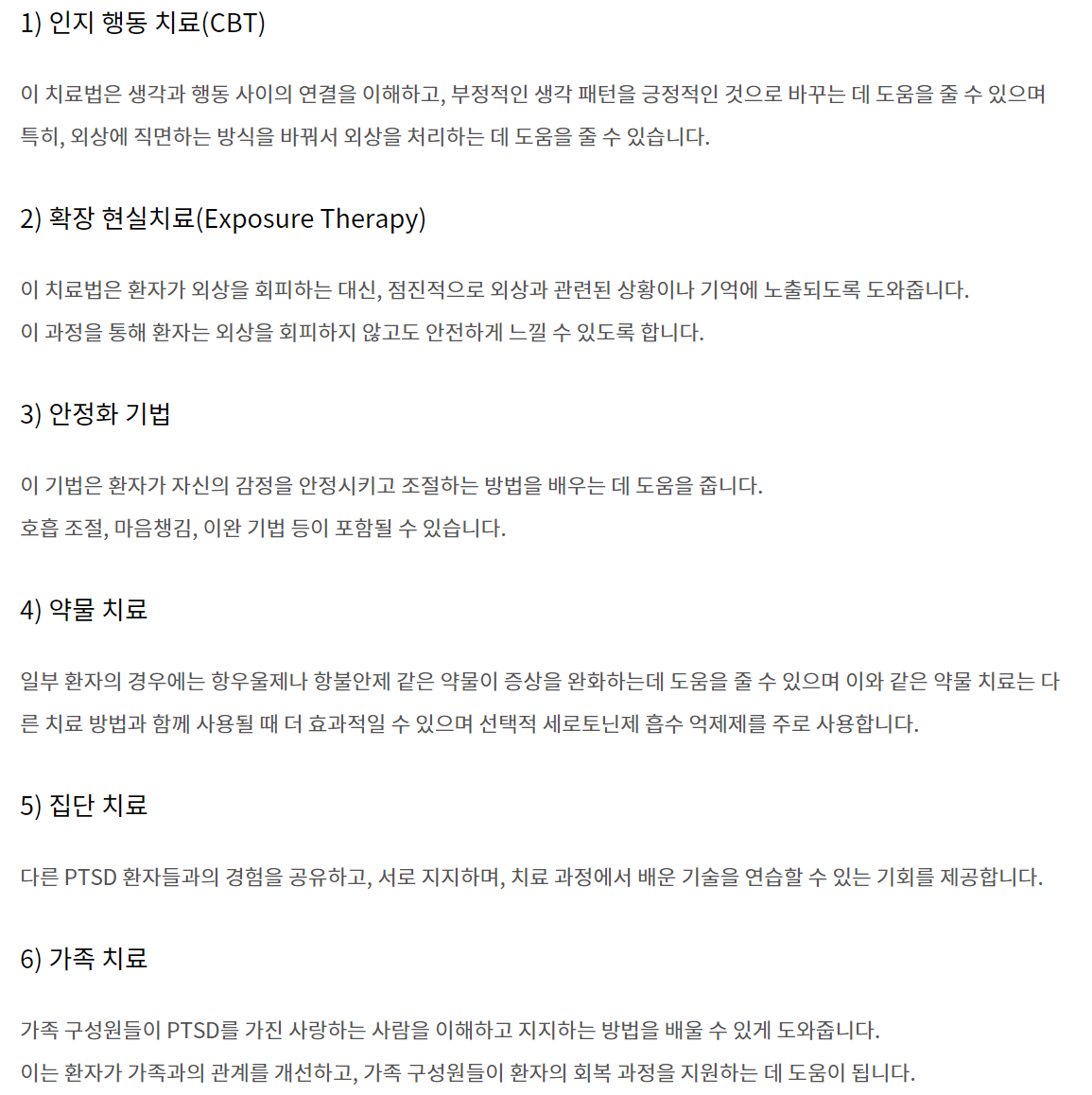 PTSD 치료는 회복에 필수적이며 삶의 질을 크게 향상시킬 수 있습니다. 주요 치료법은 다음과 같습니다: