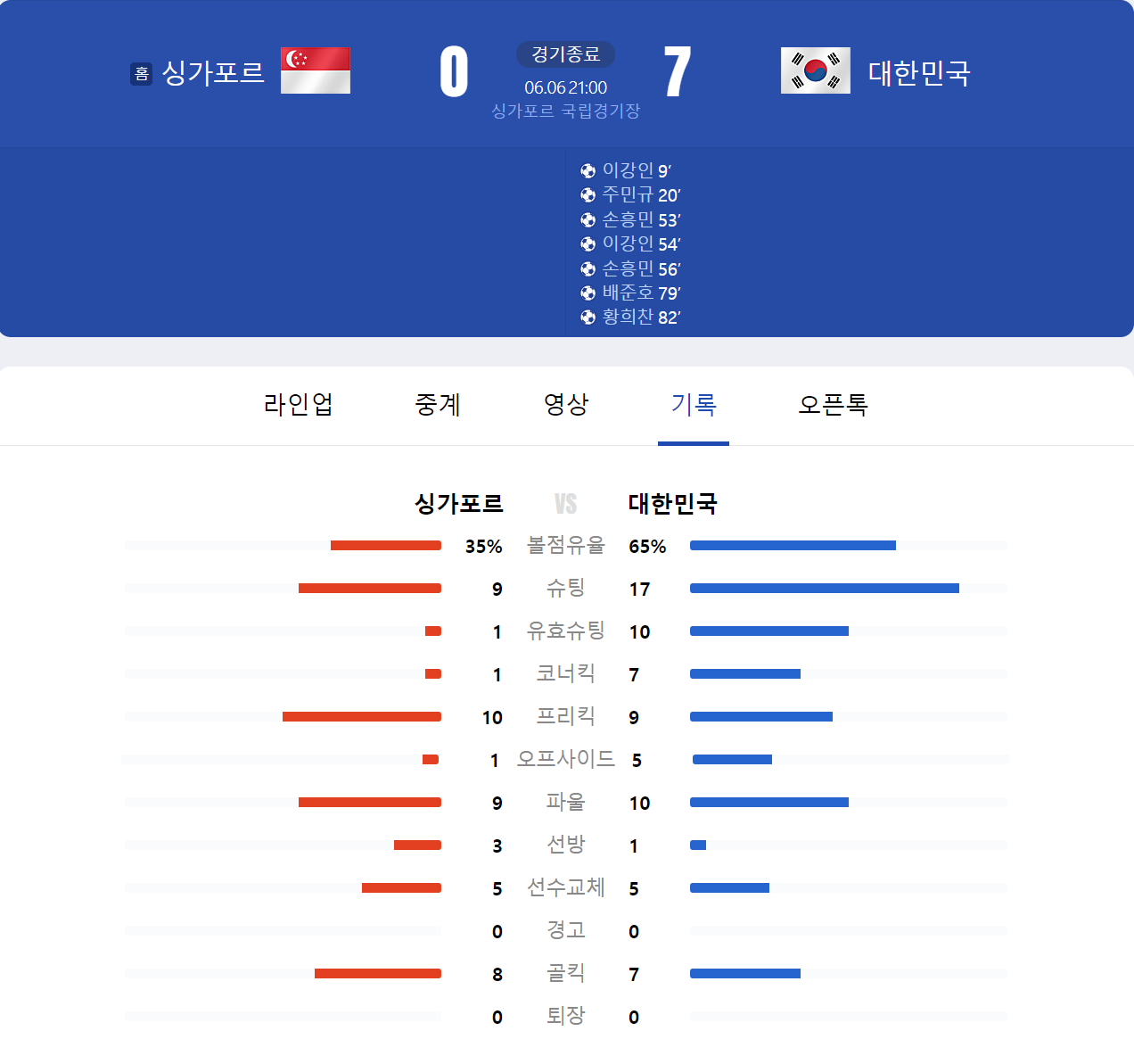 7-0 한국 vs 싱가포르 2026 월드컵 아시아 2차예선 C조 5차전 싱가포르와의 원정 경기 본문